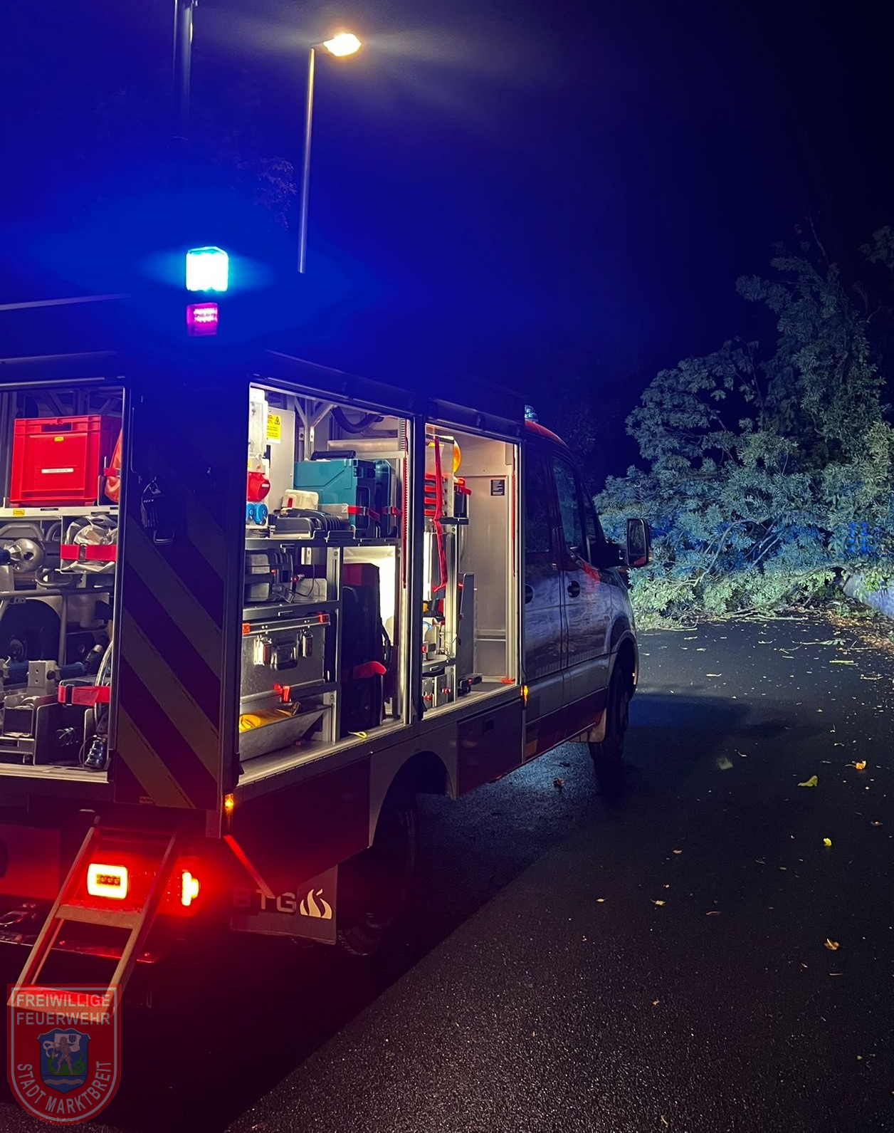 Im Ortsgebiet Marktbreit ist durch leichtes Unwetter ein größerer Baum von einem Grundstück auf einer Straße gestürzt.